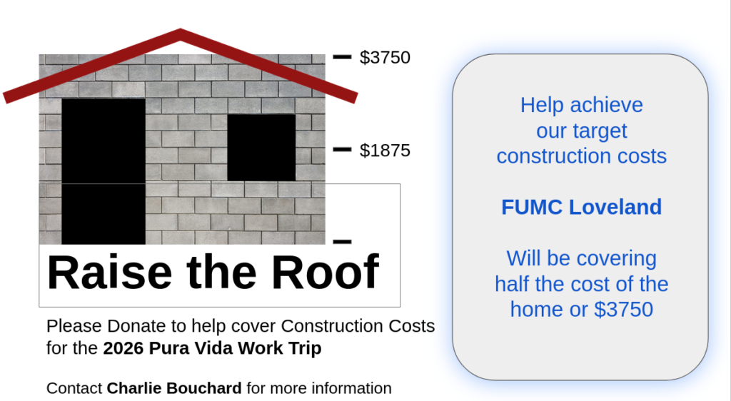 A team from First United Methodist Church, Loveland will be traveling to Guatemala to help construct a home for a deserving family there. You can join the team virtually or make a donation towards construction costs by visiting the trip page found at the Pura Vida website, puravida.org. Help reach our goal of $3750 to fund half the construction costs of the home.