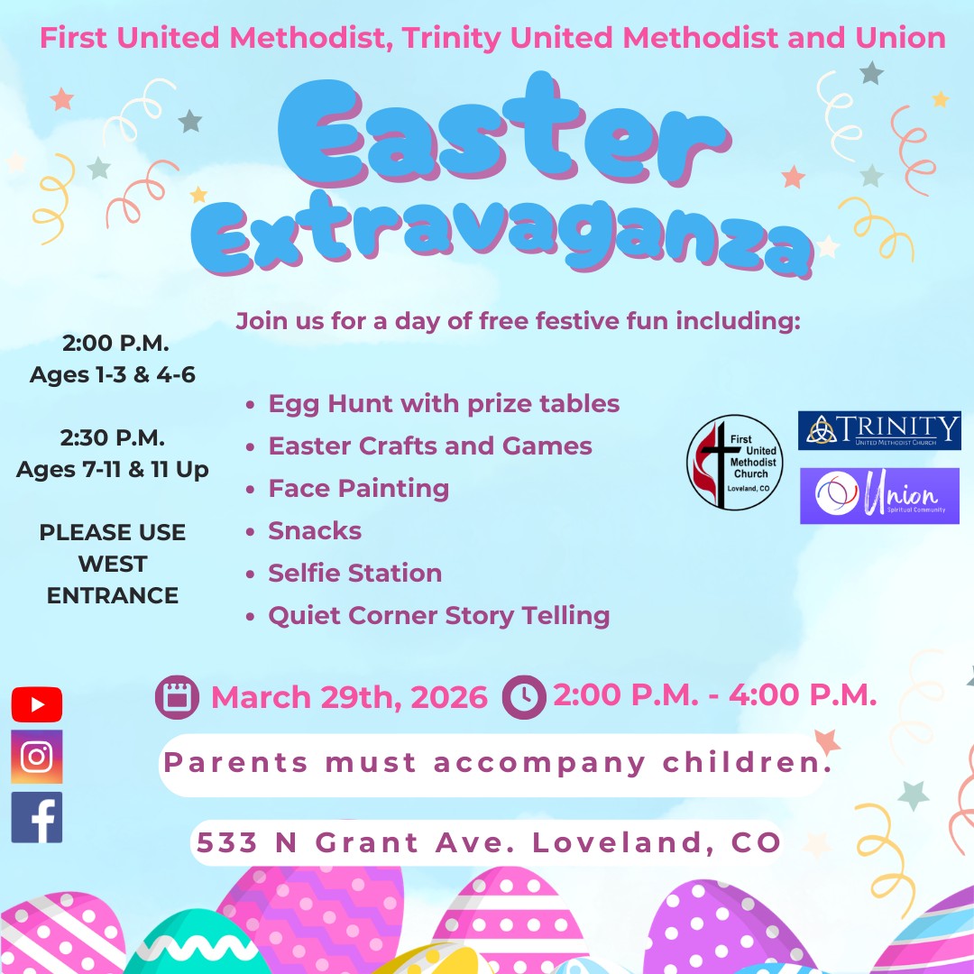 A Community Easter Egg Hunt hosted by Trinity United Methodist Church, First United Methodist Church, and Union Spiritual Community! The event is from 2:00p–4:00p at First Church (533 Grant Ave). We’re celebrating one week before Easter to avoid the rush and make space for relaxed, family-friendly fun.
